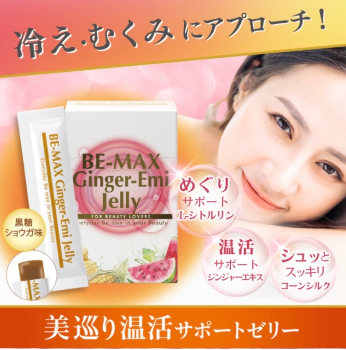 原材料名:ガラクトオリゴ糖液糖、黒糖シロップ、L-シトルリン、金時ショウガ末、コーンシルクエキス末、ジンジャーエキスパウダー、植物抽出エキス(植物抽出エキス<ミツカトウ、ベニバナ、クチナシ果実、アサ種子、ナツメ果実、ダイダイ果実、ショウガ、カンゾウ、ハッカ>、デキストリン)、ヒハツエキス末/ゲル化剤(増粘多糖類)、pH調整剤、安定剤(アラビアガム)、甘味料(ステビア)、酵素処理ヘスペリジン